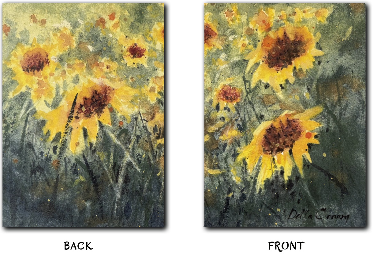 These cards feature an original artwork printed on the outside, which (when folded) displays half of the artwork on the front and half on the back. The inside of the card is left blank to allow you to share your own thoughts.