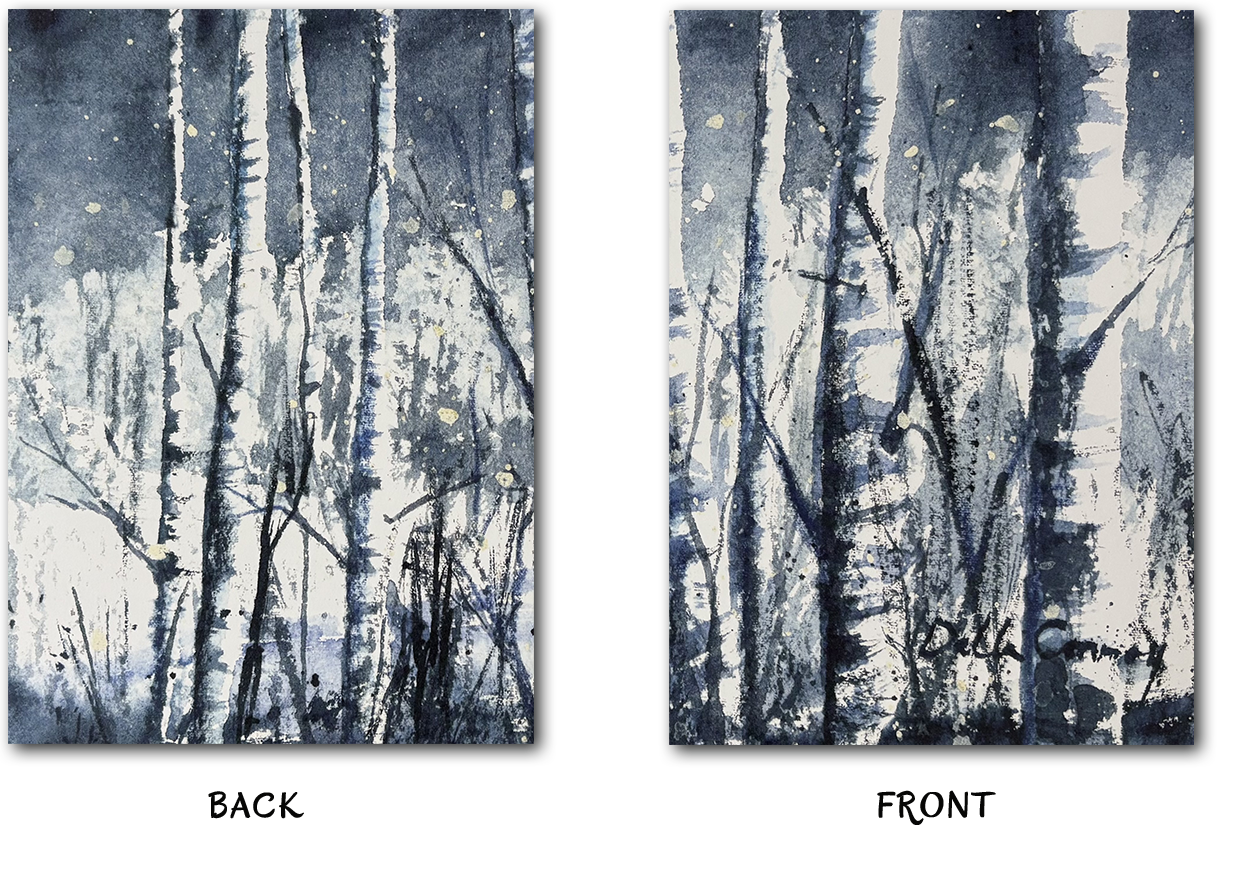 These cards feature an original artwork printed on the outside, which (when folded) displays half of the artwork on the front and half on the back. The inside of the card is left blank to allow you to share your own thoughts.